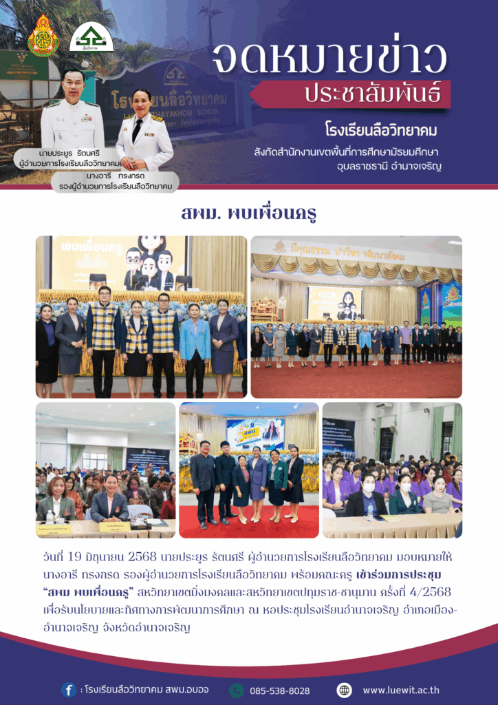 วันที่ 19 มิถุนายน 2568 นายประยูร รัตนศรี ผู้อำนวยการโรงเรียนลือวิทยาคม มอบหมายให้ นางอารี ทรงกรด รองผู้อำนวยการโรงเรียนลือวิทยาคม พร้อมคณะครู เข้าร่วมการประชุม “สพม พบเพื่อนครู”