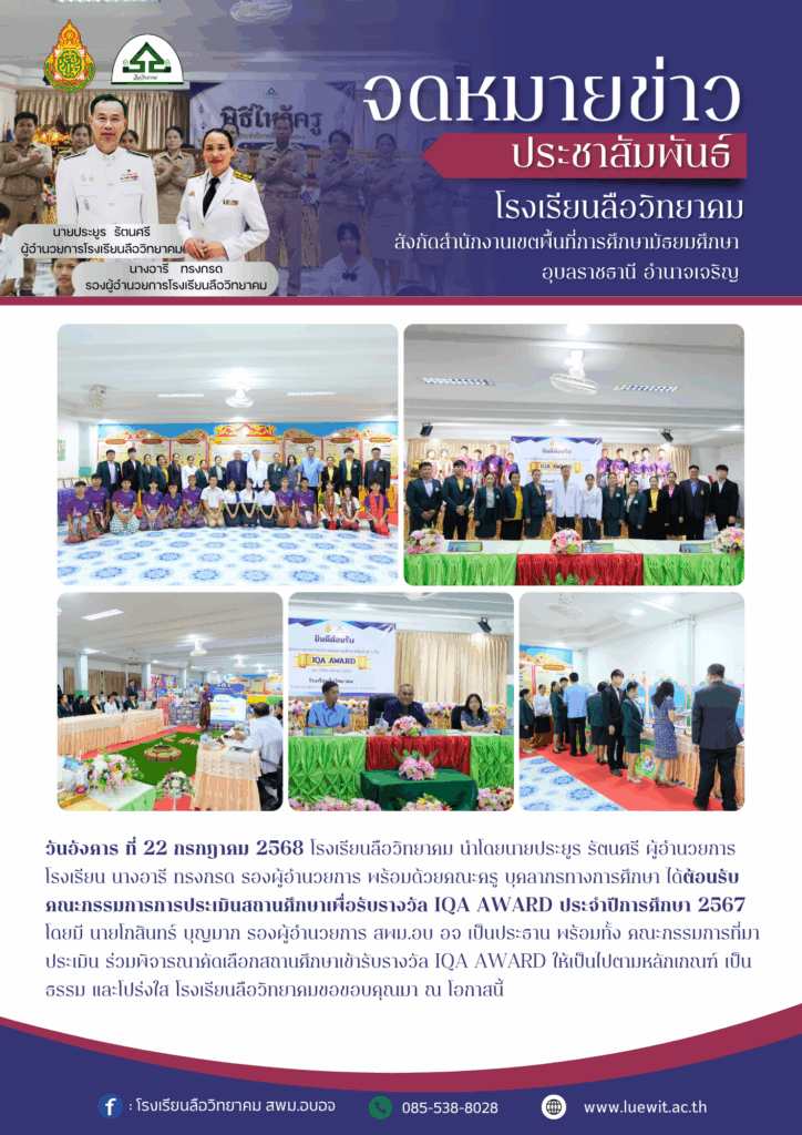 วันอังคาร ที่ 22 กรกฎาคม 2568 โรงเรียนลือวิทยาคม นำโดยนายประยูร รัตนศรี ผู้อำนวยการโรงเรียน นางอารี ทรงกรด รองผู้อำนวยการ พร้อมด้วยคณะครู บุคลากรทางการศึกษา ได้ต้อนรับคณะกรรมการการประเมินสถานศึกษาเพื่อรับรางวัล IQA AWARD ประจำปีการศึกษา 2567
